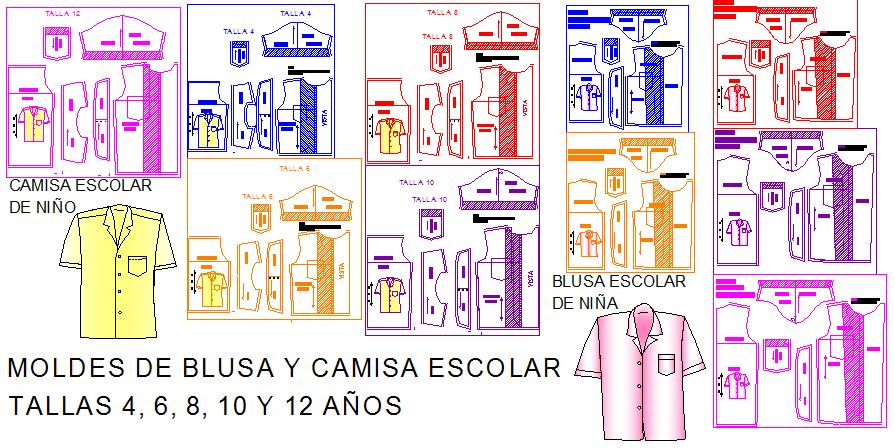 Los Moldes de Camisa Escolar vienen en las 5 tallas para niños: 4, 6, 8 10 y 12 años, llevan su margen de costura de 1 centímetro en todas sus piezas, y están en formato imprimible en plóter a escala 1:1 .