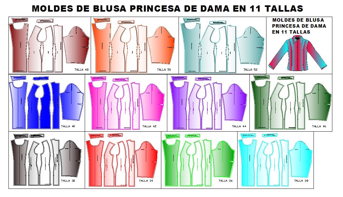 Los patrones del Modelo Clasico de Blusa Clasica Corte Princesa Manga Larga de Dama por talla vienen en las 11 tallas universales lo cual te permite abarcar casi la totalidad de medidas de dama.