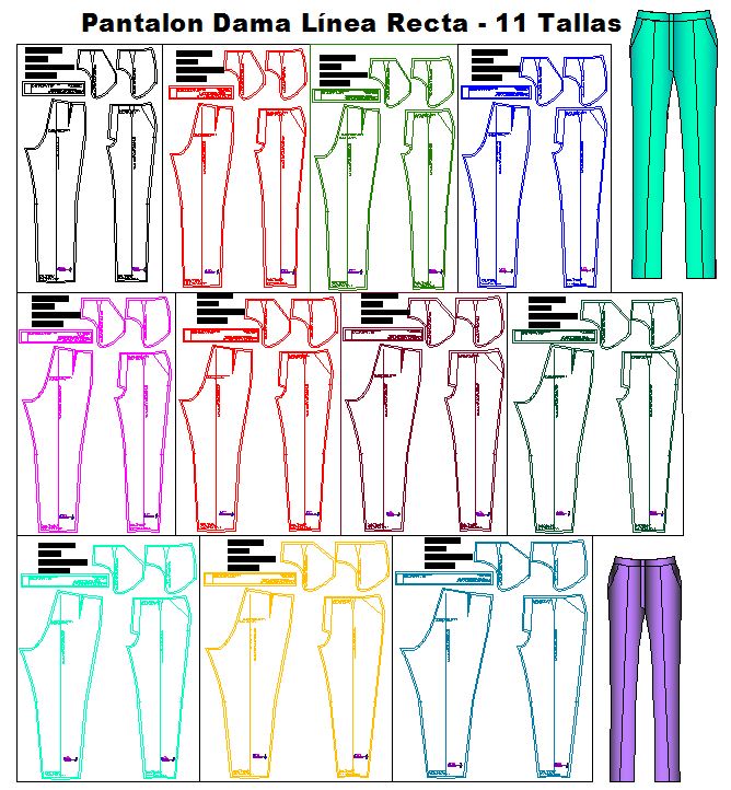 Los patrones vienen digitalizados en 3 formatos diferentes de modo que puedes seleccionar de entre las 3 opciones de formato para cada una de las 11 tallas de los patrones de Pantalon Linea Recta de Dama: