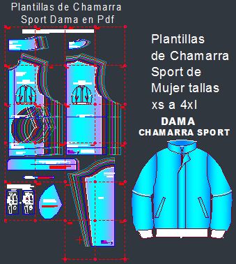 Las Plantillas de moldes de chamarra sport de dama se te envían en formato digital Pdf para imprimir en varias hojas tamaño carta las cuales armas para obtener los moldes completos en tamaño real.