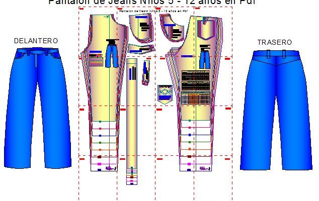 Las plantillas de moldes de pantalón tipo jeans para niños vienen en formato Pdf para imprimir en varias hojas tamaño Carta, e incluyen las tallas para niños de 5, 6, 7, 8, 9, 10, 11 y 12 años de edad.