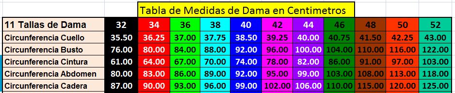 Son 11 tallas que incluyen las plantillas: Talla 32, Talla 34, Talla 36, Talla 38, Talla 40, Talla 42, Talla 44, Talla 46, Talla 48, Talla 50 y Talla 52 las cuales tienen las medidas que se dan en la tabla de tallas y medidas siguiente: